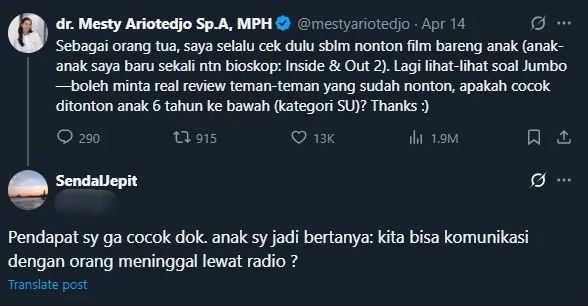 “Pendapat saya gak cocok dok. Anak saya jadi bertanya: kita bisa komunikasi dengan orang meninggal lewat radio?” begitu lah bunyi cuitan salahs seorang netizen di platform X.